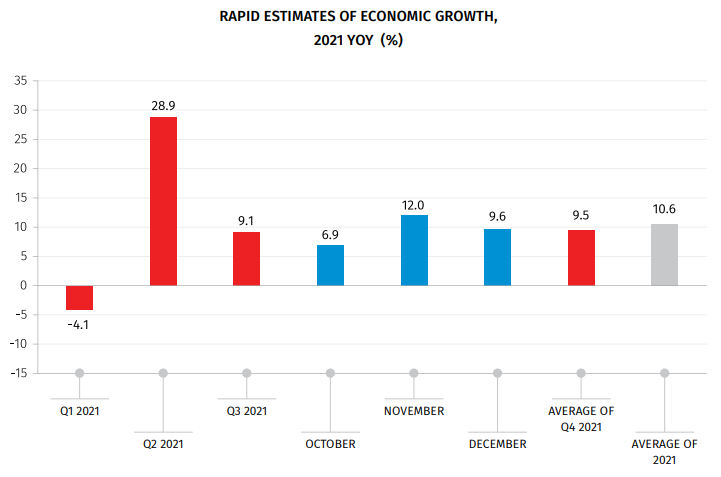 Estimated real Gross Domestic Product (GDP) growth rate in December 2021 amounted to 9.6 percent YoY and 10.6 percent in 2021 compared to previous year.