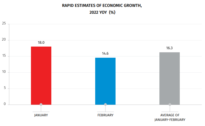 The estimated real Gross Domestic Product (GDP) growth rate in February 2022 amounted to 14.6 percent YoY and the average real GDP growth for January-February 2022 equaled to 16.3 percent YoY.