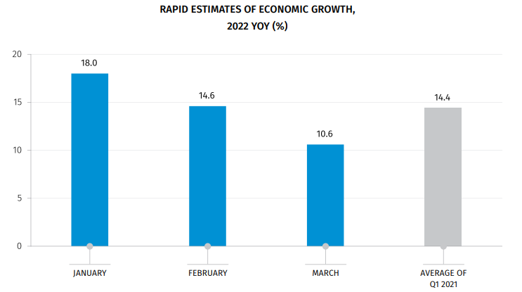 The estimated real Gross Domestic Product (GDP) growth rate in March 2022 amounted to 10.6 percent YoY and the average real GDP growth for the first quarter of 2022 equaled to 14.4 percent YoY.