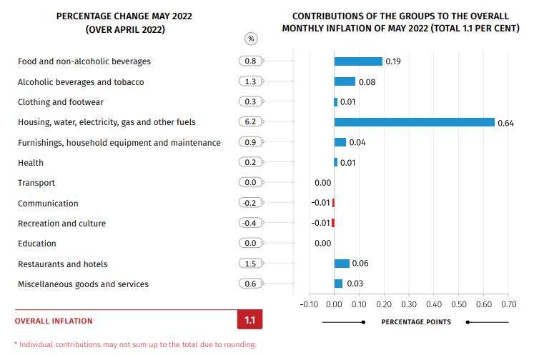 In May 2022 the Consumer Price Index increased by 1.1 percent compared to the previous month, while the annual inflation rate amounted to 13.3 percent. With regard to the annual core inflation1 , the ...