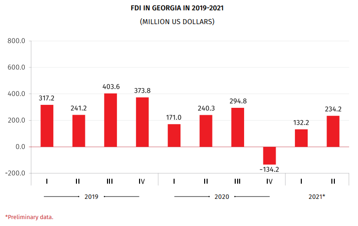 Foreign direct investments (FDI) in Georgia amounted to USD 234.2 million in Q2 2021 (preliminary data), down 2.6 percent from the adjusted data of Q2 2020.