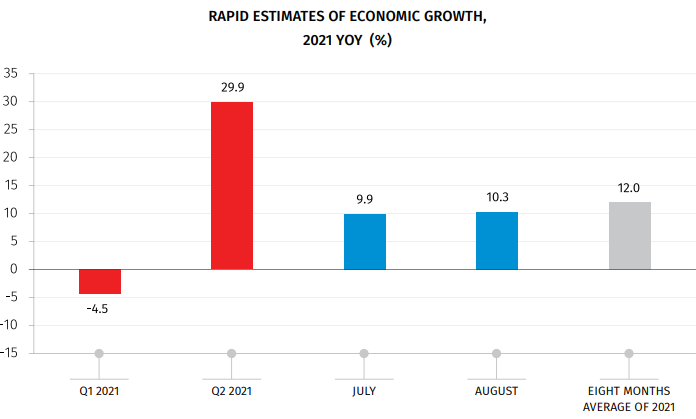 Estimated real Gross Domestic Product (GDP) growth rate in August 2021 equaled 10.3 percent YoY and 12.0 percent in January-August of 2021 YoY.