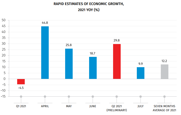 Estimated real Gross Domestic Product (GDP) growth rate in July 2021 equaled 9.9 percent YoY and 12.2 percent in January-July of 2021 YoY.