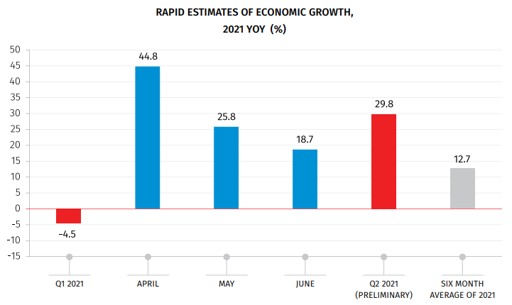 The estimated real Gross Domestic Product (GDP) growth rate in June 2021 equaled 18.7 percent YoY and 12.7 percent in January-June of 2021 YoY.