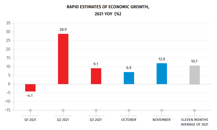 Estimated real Gross Domestic Product (GDP) growth rate in November 2021 equaled to 12.0 percent YoY and 10.7 percent YoY in January-November 2021.