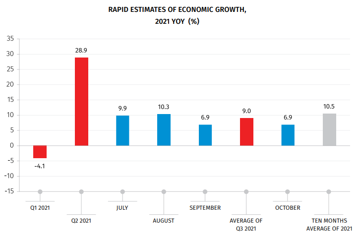 Estimated real Gross Domestic Product (GDP) growth rate in October 2021 equaled to 6.9 percent YoY and 10.5 percent in January-October of 2021 YoY