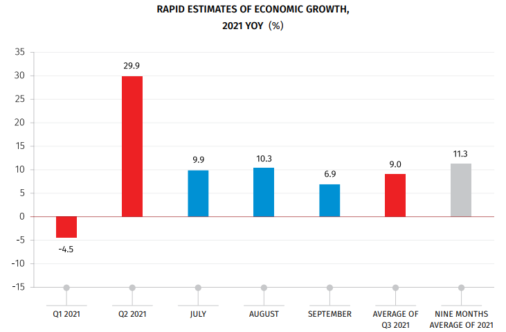 Estimated real Gross Domestic Product (GDP) growth rate in September 2021 equaled 6.9 percent YoY and 11.3 percent in January-September of 2021 YoY.