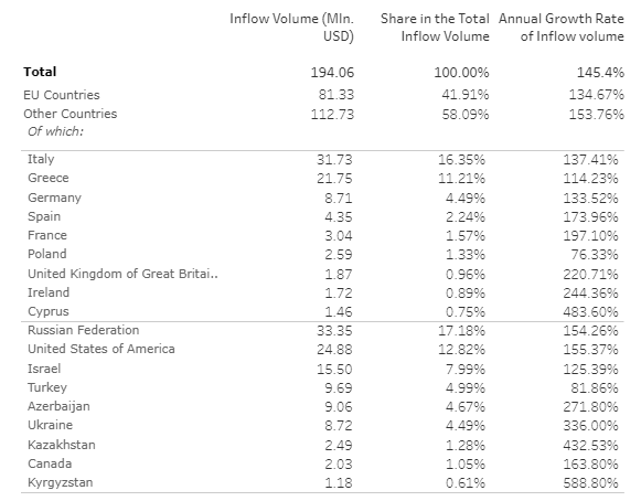 In April 2021, the volume of money transfers from abroad constituted 194.1 million USD (666.9 million GEL), which is 145.4% (115.0 million USD) more than the amount in April 2020. 94.9% percent of the total money transfers from abroad came from the 18 largest partner countries, with the volume of transfers from these countries each exceeding 1 million USD in April 2021. In April 2020 the share of these 18 countries constituted 93.0% percent of the total volume of money transfers.