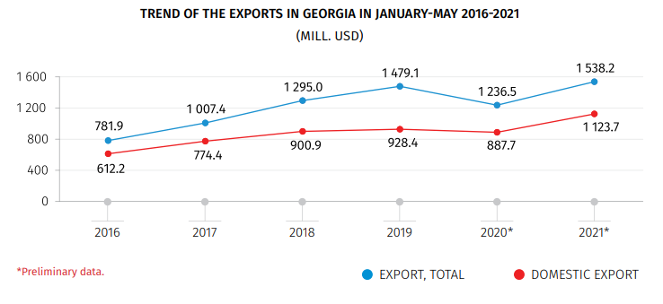 In January-May 2021 the exports of Georgia (excluding non-declared exports) equaled USD 1 538.2 million, 24.4 percent higher year-on-year. Share of the domestic exports in total export constituted 73.1 percent and amounted to USD 1 123.7 million, 26.6 percent higher to the same period of 2020.